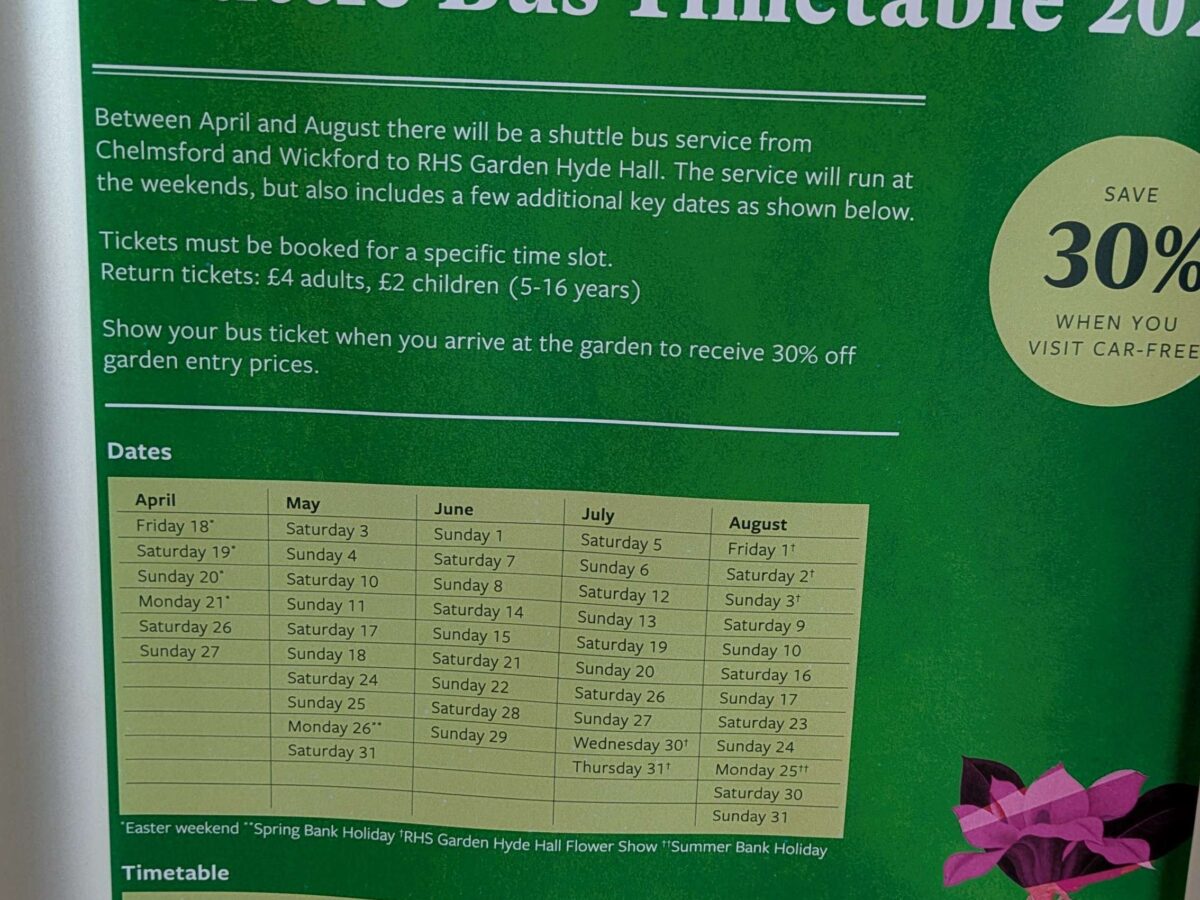 Shuttle bus tickets also entitle visitors to 30% off RHS Garden Hyde Hall entry tickets.